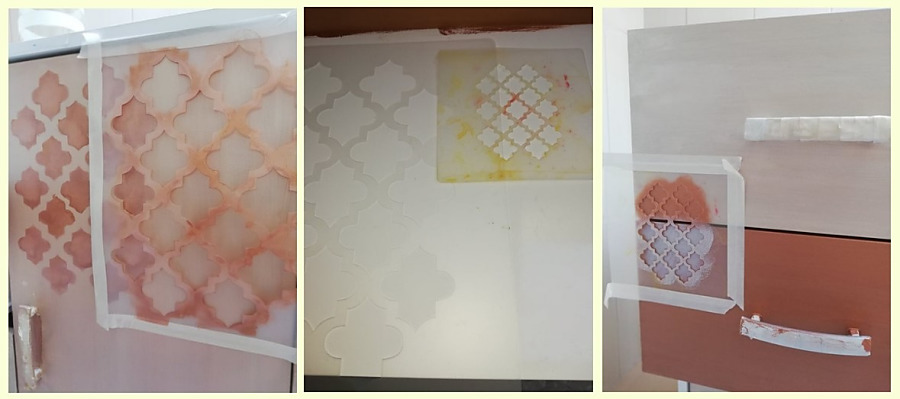 3. Povrch ( ktorý som chcela maľovať ) som pretrela podkladovou farbou bielou , ktorú necháme vyschnúť ( cca 30min ) a môžeme maľovať farbami kriedovými, minerálnymi, metalickými alebo mliečnymi. Použila som metalické akrylové farby v troch odtieňoch, ktoré sa dobre kombinujú aj spolu ladia. Bolo potrebné pretrieť povrch dvoma vrstvami farieb. Základ je hotový. Na finálny efekt som použila šablóny na maľovanie - vačší vzor ( marrakech ST166 ) a menší vzor ( marrakech ST190 ) ktorý sa pekne dá skombinovať. šablóny prichytíme maliarskou páskou, namaľujeme vzor, počkáme kým vyschne a maľujeme ďalší. Použijeme tupovacie štetce a dáme si pozor, aby sme na vzor nedávali príliš veľa farby, pretože by nám farba zatekala pod šablónu. Je vhodné po zaschnutí farby maľovaný povrch aj jemne zbrúsiť, aby sme získali hladký povrch. Po šablónovaní som maľovaný povrch ošetrila bezfarebným voskom.