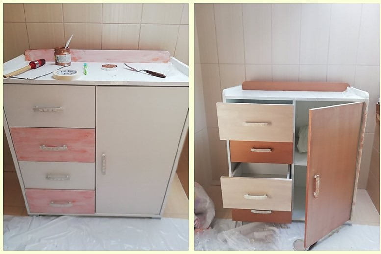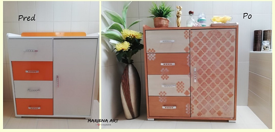 Ako je vidno na fotke, komoda je vo výbornom stave, vyrobená z mdf dosiek - farba biela a oranžová. Kúpeľňa je však v odtieňoch béžovej a hnedej. Tak sa pustím do práce.