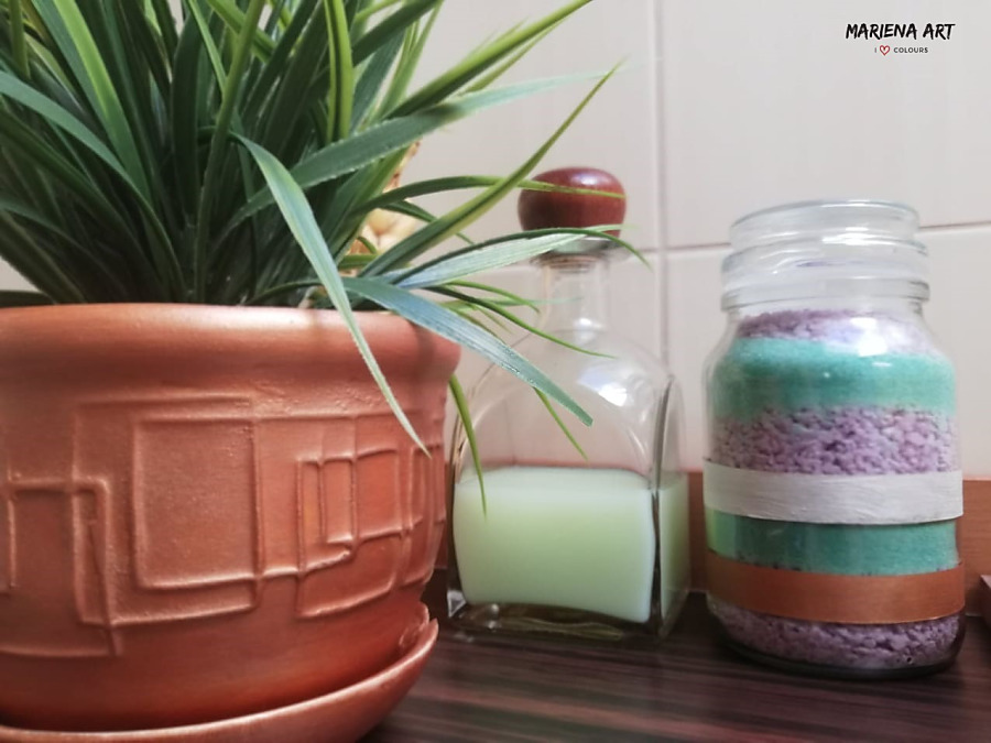 Keď som už mala farby otvorené, namaľovala som aj starý keramický kvetináč a sklenenú fľašu, ktorá poslúži na soľ do kúpeľa.
