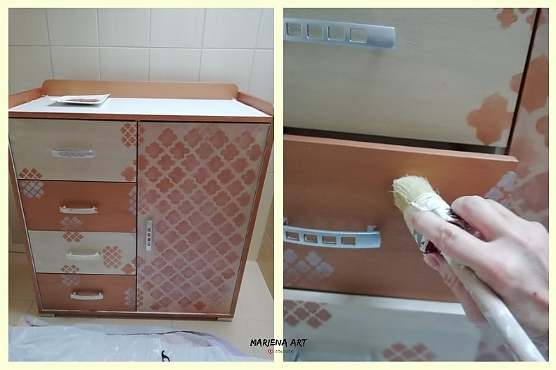 3. Povrch ( ktorý som chcela maľovať ) som pretrela podkladovou farbou bielou , ktorú necháme vyschnúť ( cca 30min ) a môžeme maľovať farbami kriedovými, minerálnymi, metalickými alebo mliečnymi. Použila som metalické akrylové farby v troch odtieňoch, ktoré sa dobre kombinujú aj spolu ladia. Bolo potrebné pretrieť povrch dvoma vrstvami farieb. Základ je hotový. Na finálny efekt som použila šablóny na maľovanie - vačší vzor ( marrakech ST166 ) a menší vzor ( marrakech ST190 ) ktorý sa pekne dá skombinovať. šablóny prichytíme maliarskou páskou, namaľujeme vzor, počkáme kým vyschne a maľujeme ďalší. Použijeme tupovacie štetce a dáme si pozor, aby sme na vzor nedávali príliš veľa farby, pretože by nám farba zatekala pod šablónu. Je vhodné po zaschnutí farby maľovaný povrch aj jemne zbrúsiť, aby sme získali hladký povrch. Po šablónovaní som maľovaný povrch ošetrila bezfarebným voskom.