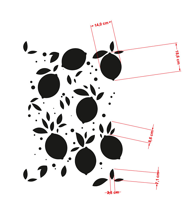 Šablóna na maľovanie Citrón - Lemon. Pomocou šablónynamaľujete na stenu a nábytok citrónové vzory. Šablóny na kreatívnu tvorbu majú všestranné využitie. Vďaka rozmanitosti vzorov ich využijete takmer kdekoľvek - na steny, nábytok, drevo, textílie, keramiku, obkladačky. Kolekcia šablón DECODIZAJN - moderné vzory, ornamenty, tapetové motívy a bordúry.