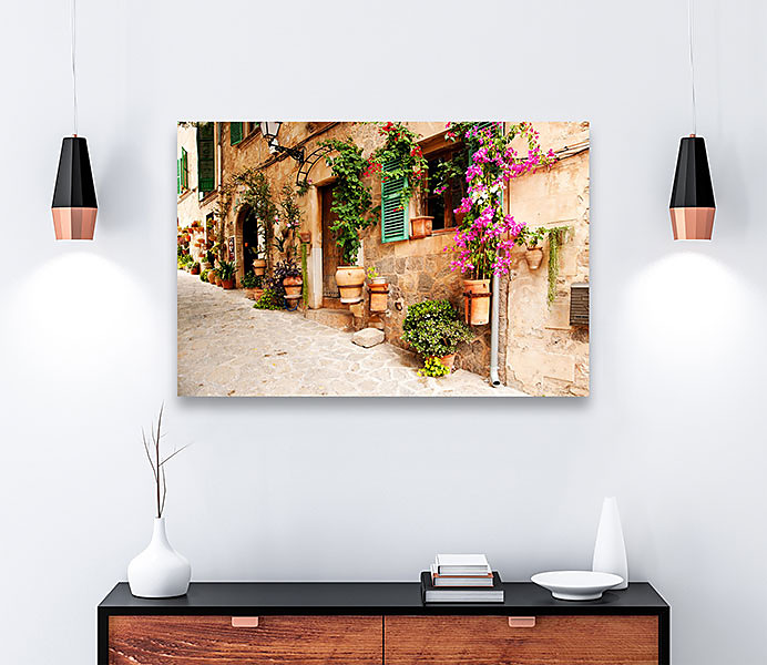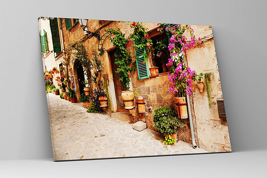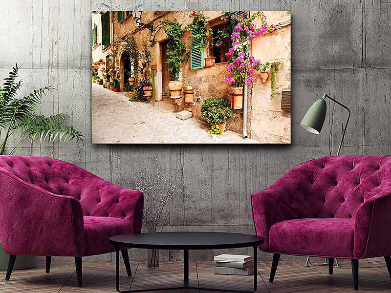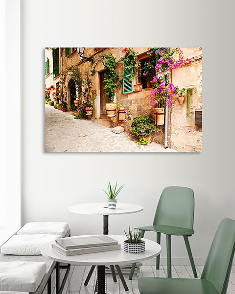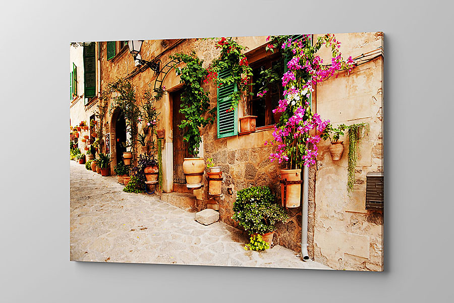 Obraz na plátne Kvety na stene, flowers on the wall, kamenná ulička