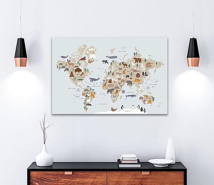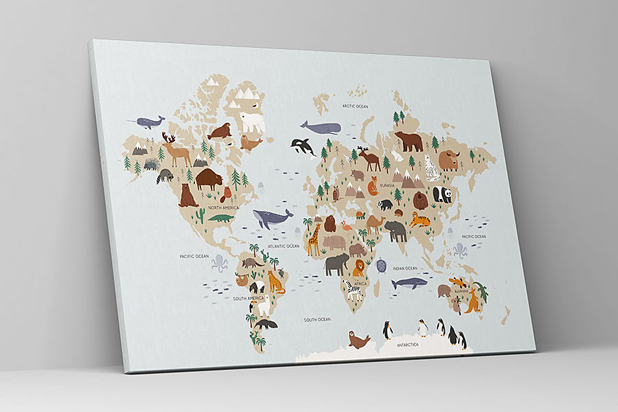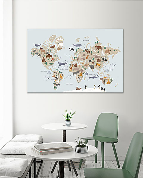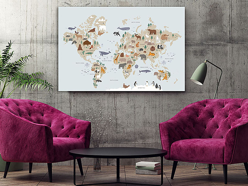 Obraz mapa sveta zvierat pre deti je ideálnym spôsobom, ako skombinovať vzdelávanie a zábavu v detskej izbe. Táto farebná a detailná mapa zobrazuje rôzne druhy zvierat, čím pomáha deťom lepšie pochopiť geografiu a biodiverzitu našej planéty. S takouto dekoráciou sa učenie stáva hrou, pretože deti môžu objavovať nové kontinenty a krajiny prostredníctvom fascinujúcich ilustrácií zvierat. Obraz nielenže oživí priestor a dodá mu hravú atmosféru, ale tiež podporuje zvedavosť a rozvoj poznania už od útleho veku. Kreslené doodle zvieratká v škandinávskom štýle pre deti.