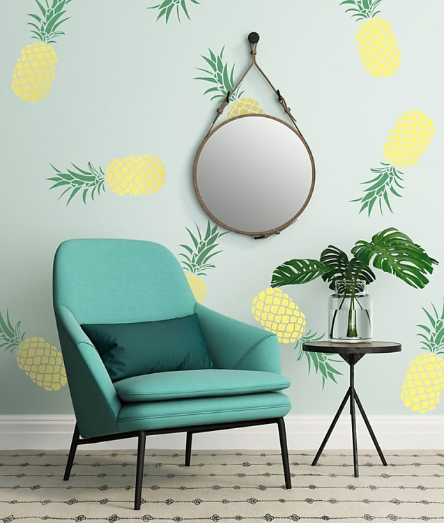 Tropický interiér v štýle urban jungle? Pomocou šablóny Ananás - Pineapple namaľujete na stenu a nábytok tropické a ovocné vzory. Šablóny na kreatívnu tvorbu majú všestranné využitie. Vďaka rozmanitosti vzorov ich využijete takmer kdekoľvek - na steny, nábytok, drevo, textílie, keramiku, obkladačky. Kolekcia šablón DECODIZAJN - moderné vzory, ornamenty, tapetové motívy a bordúry.